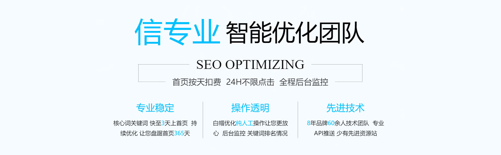 關(guān)鍵詞優(yōu)化,無(wú)效果退款!專業(yè)技術(shù)管控賬戶,減少無(wú)效點(diǎn)擊,全方位網(wǎng)絡(luò)推廣,讓您的信息遍布互聯(lián)網(wǎng)。